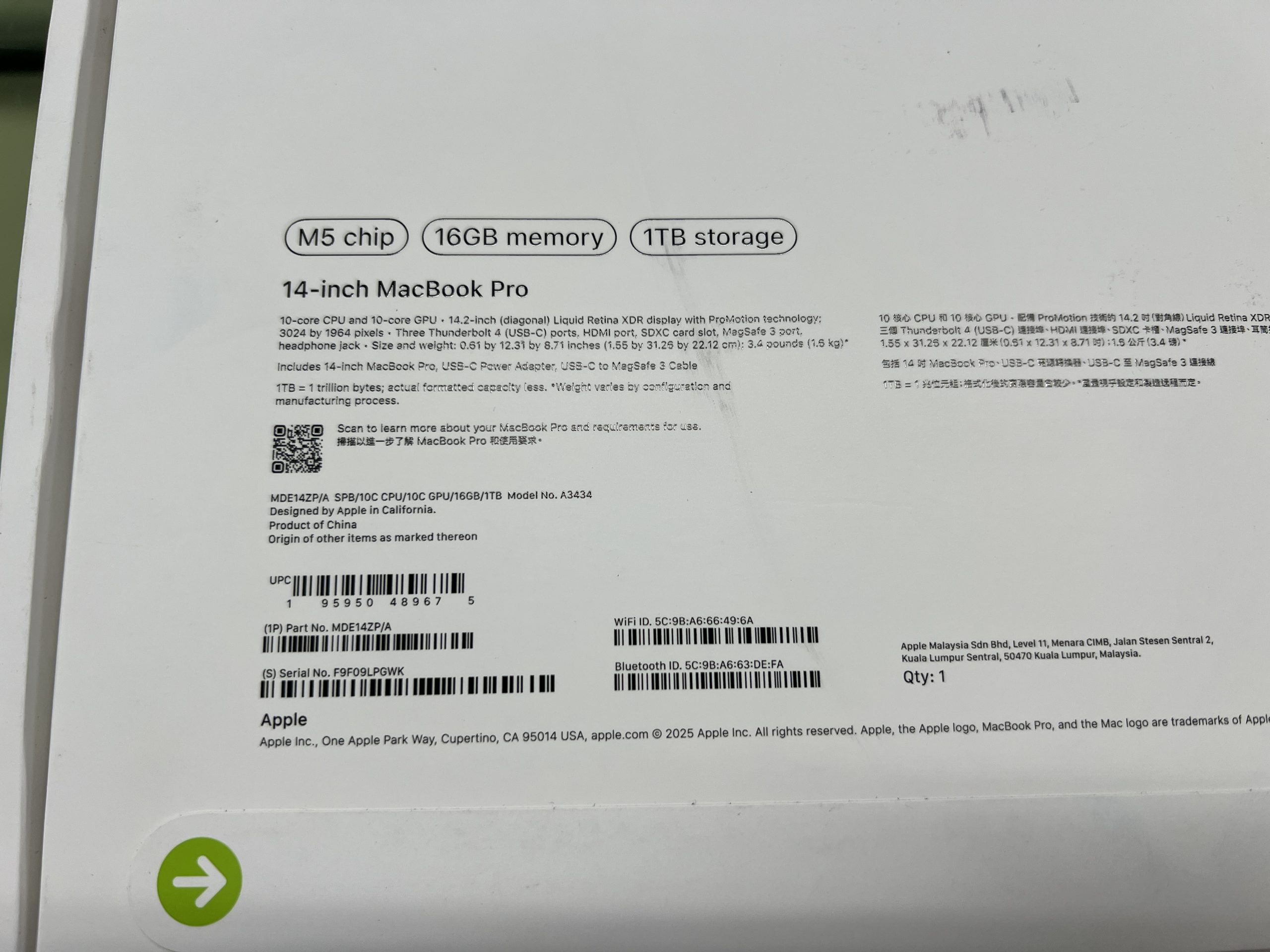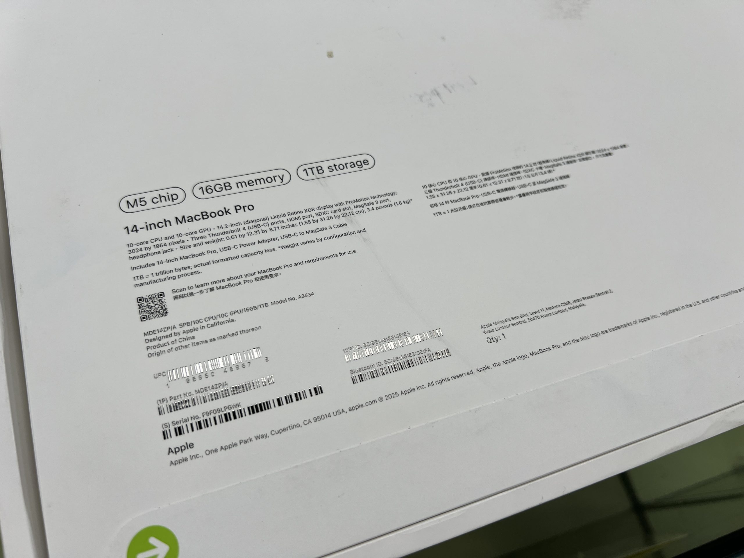 MacBook Pro 14″ M5 16GB 1TB 1750usd